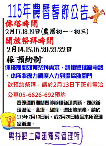 土庫殯葬管理所115年度農曆春節連假休塔時間公告